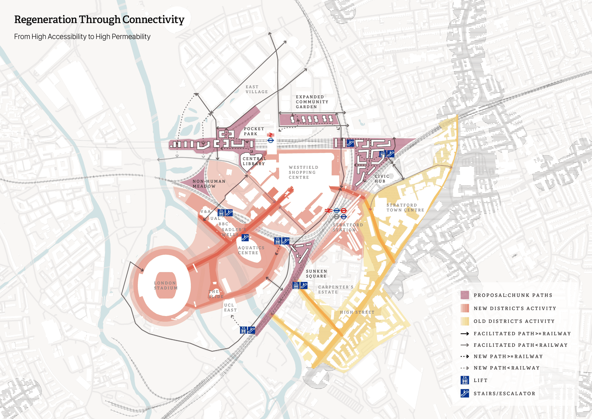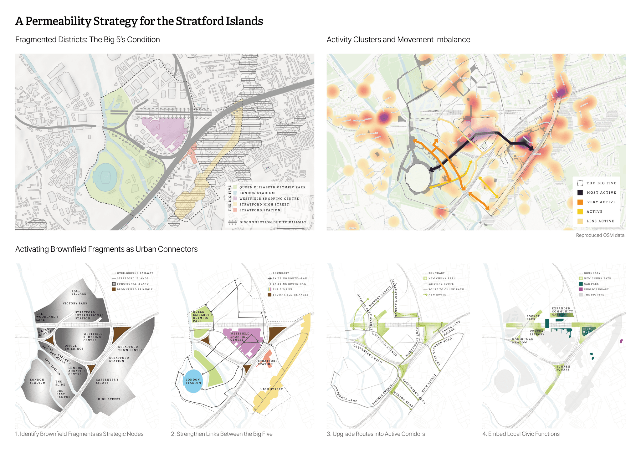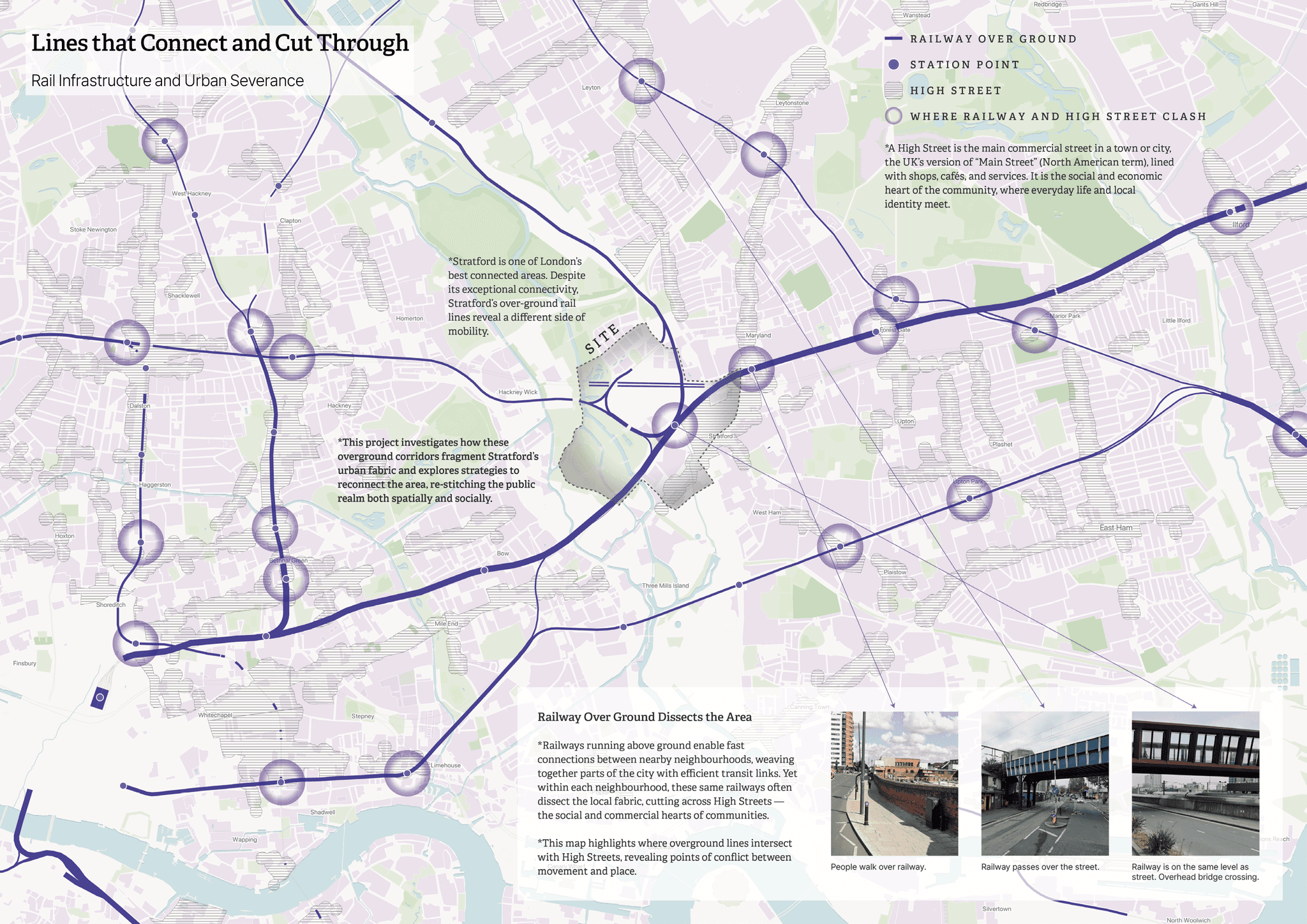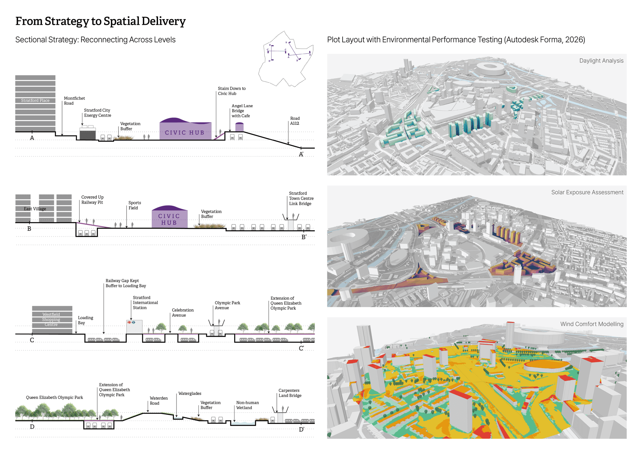 Stratford Islands proposes a spatial strategy to address the hidden fragmentation within one of London’s most connected transport hubs. Despite Stratford’s high public transport accessibility, elevated rail infrastructure and waterways create significant urban severance, limiting pedestrian permeability across the district. The project identifies five key destinations—Queen Elizabeth Olympic Park, London Stadium, Stratford Station, Westfield, and Stratford High Street—that define Stratford’s urban identity but remain weakly connected. In response, the strategy focuses on strengthening movement between these anchors rather than expanding the city fabric. Three triangular residual sites formed by railway lines are reimagined as new urban nodes, transforming leftover infrastructural land into active civic connectors. Through sectional design and environmental modelling, the proposal integrates pedestrian routes, public spaces, and development plots across multiple levels. The resulting masterplan shifts Stratford from a district defined by high transport accessibility to one characterised by strong urban permeability.